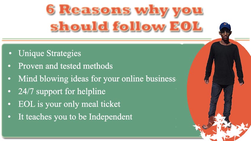 EOL is bringing fresh ideas you have never thought existed. This blog like I said; it is mainly for people who want to learn how to start their own online business, as well as the African youths who do not know there is a way in which you can make money online without paying much.